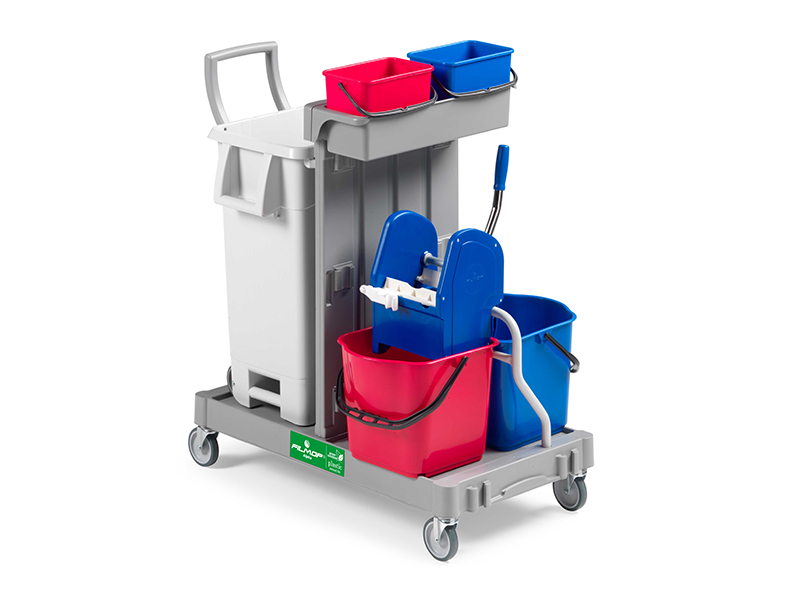 این سطل زباله کاربردی در قسمت بالا و پایین مجهز به دسته می باشد در نتیجه جابجایی و تخلیه آن بسیار آسان خواهد بود و می توان آن را با درپوش و دسته مخصوص هل دادن تجهیز نمود تا ابعاد کلی آن کاهش یافته و فشرده تر شود. ترولی نظافت Alpha 0401402 به صورت کاملا مقاوم، فشرده، ارگونومیک و ماژولار طراحی و تولید شده است و در ساخت آن از ماده قابل بازیافت و سازگار با محیط زیست پلی پروپیلن استفاده شده است. طراحی ماژولار این ترولی چند منظوره امکان اضافه نمودن بخش های متفاوت را به آن فراهم می نماید. همچنین به منظور افزایش مقاومت و تعادل ترولی، می توان یک چرخ اضافه به مرکز شاسی آن اضافه نمود. امکان تعویض چرخ های تی شور با چرخ های لاستیکی 125 میلیمتری نیز وجود دارد که استفاده از این چرخ ها باعث حرکت روان تر و کم صداتر ترولی بر روی سطوح به ویژه سطوح ناهموار خواهد شد.